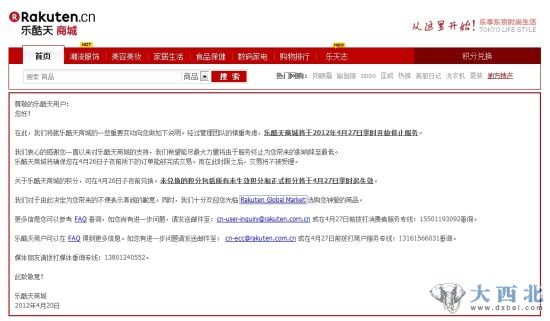 乐酷天商城首页公告通知,商城将于2012年4月27日零时开始停止服务