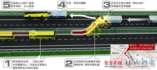 就在昨日上午,张平安等31名游客从上海乘坐大巴,行驶至沿江高速公路常熟段时,大巴突然冲过路面中间的隔离护栏,与对面一辆货车猛烈相撞。截至今日凌晨,这起车祸已造成13人死亡、21人受伤。