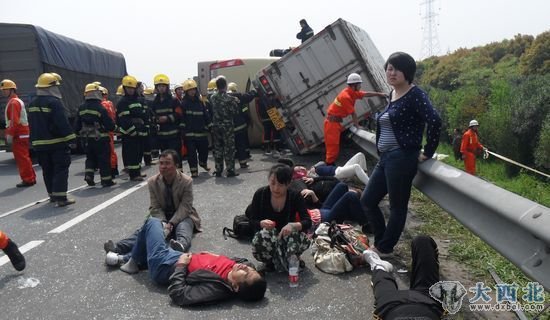 昨日,上海一辆旅游大巴在沿江高速公路常熟段冲破中间护栏,与一辆货车相撞,自行爬出车的乘客或坐或躺,等待救援。 大巴受伤乘客 刘伟良 图