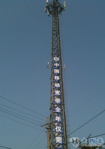青岛街头中国移动的基站上也挂着其推广WLAN的标语
