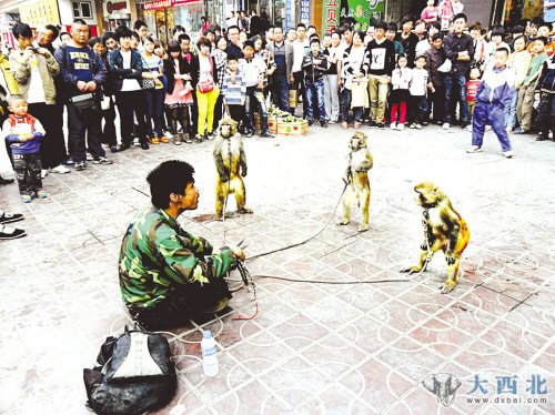 五一小长假期间,记者在西关十字西南角看到,上百位市民围了一个大圈,一个大约三十岁的男子,站在圈中空地的中央,脚下踩着三根挽在一起的绳子,三根绳子的另一头各拴着一只猴子。而这名男子手中拿着一条短皮鞭,不断对猴子下达着各种命令。