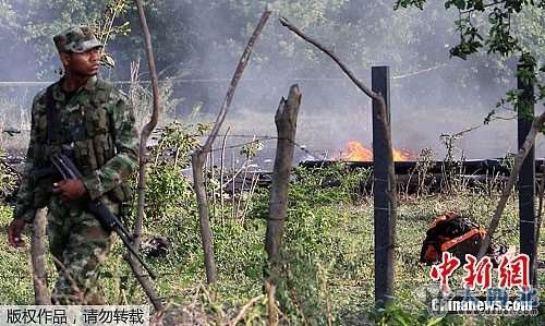 当地时间4月30日,哥伦比亚一架贝尔212型军用直升机在大西洋省Sabanagrande附近坠毁,造成13名军人遇难。截至目前,事故原因仍未查明。图为坠机现场。