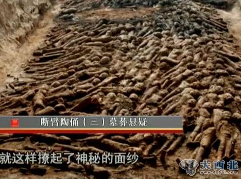 在陕西西安南部一个叫凤栖原的地方,发现了一处规模庞大的墓葬,出土了一千多件陶俑,并且这批陶俑全部是裸体的,而且没有双臂,工作人员研究证实这批陶俑曾经是有过衣服的,还发现陶俑本身是有双臂的,只是因为采用的材料不同,双臂部分都已经腐朽了……