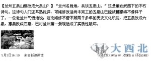 5月3日,新浪网友《兰州五泉山要改成六泉山?》的微博一经发布,立刻引发众多网友“拍砖”,甚至有网友调侃:六个泉?以为是他们家水龙头呢,想装几个就几个。