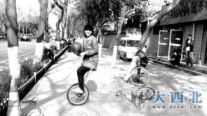 说到这些,贺明已经轻巧地坐上了独轮车,“将脚踏放在水平的位置,用向后登的力让身体向前而保持平衡,这是需要技巧的。”说完便骑着独轮车远去了,走走停停、原地转圈,贺明向记者和公园中的市民展示了一些基本的技巧,大家没有想到的是,这个原本只能在杂技表演中看到的项目,现实生活中也有人将这“异常”灵活的独轮车掌握的那样好。