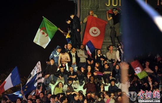 法国社会党候选人弗朗索瓦·奥朗德在5月6日晚结束的总统选举第二轮投票中战胜现任总统尼古拉·萨科齐,成为新一届法国总统。根据5月6日第二轮投票结束后公布的较为准确的结果,奥朗德获得51.67%的选票,而代表执政党人民运动联盟参选的现任总统萨科齐获得48.33%的选票。图为奥朗德阵营在巴黎巴士底广场庆祝胜利,阿尔及利亚和突尼斯的国旗也出现在人群中。中新社发龙剑武摄