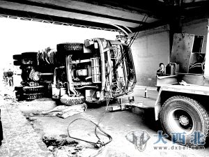 昨日9时,记者接到市民热线,来到硷沟沿双洞子附近看到,一辆黄色货车翻倒在地,挡风玻璃被甩到两米以外的人行道上,车上装载的施工用沙也散落一地,两辆吊车正在交警的指挥下慢慢地将货车拉起,因为车体自身自重较大,加之现场所处的位置在硷沟沿双洞子桥下,吊车的活动范围受到了一定的影响,给吊车工作增加了不少困难。