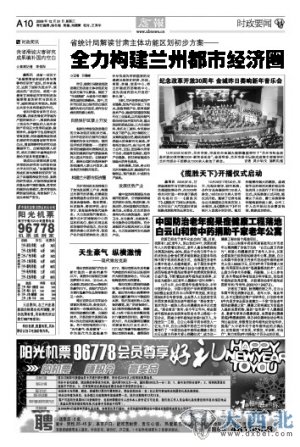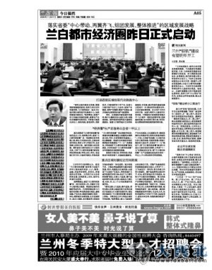 2009年7月7日,本报《产经新闻》推出“兰州都市圈分析”系列文章,对呼之欲出的兰州都市圈的分析、畅想、思考、建议,轮番呈现在版面上。同年11月26日甘肃省政府新闻办公室召开新闻发布会,落实省委“中心带动、两翼齐飞、组团发展、整体推进”的区域发展战略,兰白都市经济圈正式启动;2010年1月30日,兰州市委、市政府和白银市委、市政府在兰签订“兰州白银区域合作发展框架协议”,这标志着“兰白都市经济圈”建设由决策阶段进入实践阶段。