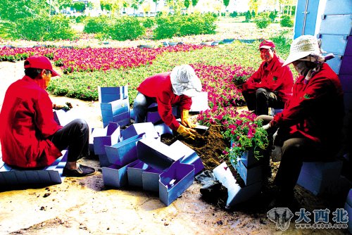 下午3时许,忙碌在雁滩黄河大桥下面的园林绿化工们有些热得难支了,他们不约而同地在自己的背包里搜寻着消暑的饮品,韩师傅熟练地掏出一瓶“营养快线”来,还没来得及和记者搭话,就先咕嘟咕嘟灌了两大口。“家里人昨天晚上熬的绿豆水,热天喝着最好。”韩师傅是极其老实憨厚的人,他毫不避讳自己瓶子里的秘密。喝汤归喝汤,活还是耽误不得。于是韩师傅一边和记者聊着,一边熟练地载起盆花来。种花、埋土、捏土、装盆、摆花……显然,韩师傅对自己所干的工作已经很熟练了,尽管在记者看来这一套活似小孩玩耍,但对于每天都要将相同的工作做到12个小时以上的园林绿化工人们来说,这无疑是个苦差事。