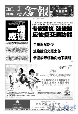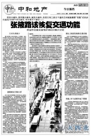 西关大堵车,滨河路大堵车,城关大堵车,东西只有三条主干道的兰州城真需要“花瓶”式的步行街吗?2009年11月23日,鑫报A3版推出独家新闻系列策划报道《张掖路该恢复交通功能》。鑫报提出,张掖路步行街建成后2年时间里,随着兰州商贸中心城市功能作用逐渐加强和西关商圈的日益繁荣,该地段的交通矛盾日益突出,兰州狭长的地形决定了东西向应成为这座城市的交通主干道而非商业核心。在兰州的城市功用方面,张掖路应是一条通道而不会是通常意义上的商业街。在现行道路基础建设欠账多,机动车辆大幅增加、轨道交通还仅仅处于设计方案编制的现状下,张掖路步行街应考虑尽快恢复其原有的东西大通道的交通功能。随后本报记者顶着来自各方的压力,通过采访有关专家,热心市民、政府官员等对张掖路恢复通行的可行性及其利弊连续采编稿件刊发,引起社会各界强烈关注。
