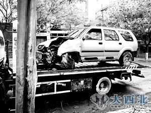 昨日,在龚家湾加油站附近的小道上,一辆越野车驶向武山路主干道时,恰遇迎面过来一辆轿车。为避免与之相撞,越野车司机加大油门,向马路对面驶去,不料由于速度太快还没来得及打方向盘,车已经撞上路边的大树,大树被撞弯了腰,树皮也撞掉了一大块,而越野车的整个车头,也被撞得严重变形了。