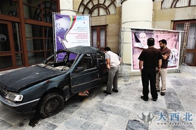 2011年5月14日,德黑兰,核专家遇刺身亡的汽车在伊朗反恐会议上展出。