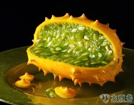 1.非洲角瓜:表皮坚硬、凹凸不平、看上去有些让人恶心的非洲角瓜是许多人挚爱的水果,肉质细腻多籽,口味清甜,吃过后,嘴里会有轻微的余香。