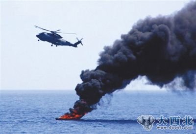 英国国防部15日披露照片显示,印度洋上中弹的海盗船起火,冒起黑烟。