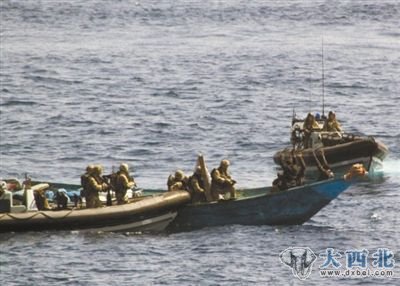 英国国防部15日披露照片显示,英国海军登上海盗船,几名海盗举手投降。