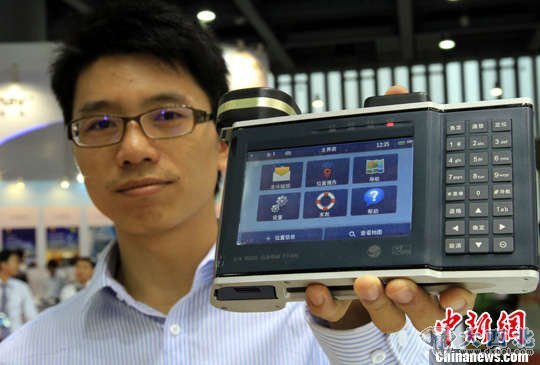 图为参展商展示利用北斗卫星导航系统研制的一款手持导航应急终端产品。中新社发孙自法摄