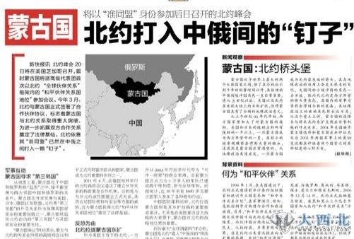 新快报讯 北约峰会20日将在美国芝加哥召开,届时蒙古国将派高级代表团首次以北约“全球伙伴关系”框架内的“和平伙伴关系国地位”参加会议。今年3月,北约与蒙古国正式签署了合作伙伴协议,标志着蒙古国与北约关系取得重大突破,为进一步拓展双方合作关系奠定了法律基础。北约依靠其“准同盟”已然在中俄之间打入一颗“钉子”。