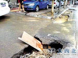 记者发现,正如这位环卫工人所说,已经塌陷的坑里立着一块木板做标示牌,从坑洞口往里看,已经有很长一段路面处于悬空状态。原来停放在该路段上的一些车辆也自觉停到了人行道上。记者步行从西津路七里河人行天桥一路数到小西湖立交桥,不过300米长的慢行车道上,大大小小的坑洞多达十四五处,很多坑洞有一个共同的特点就是坑洞内黄土下沉,坑洞周边的路面皆处于悬空状态,潜在危险性很大。奇怪的是紧贴道牙的这些坑洞明显已经处理过,但不知何故没有进行修复。昨日中午,在西津路七里河公交车站附近,看着“悬挂”在塌陷坑边上的“尼桑”小轿车,路人无不驻足观看,为如何将车子从坑里开出而出谋划策。