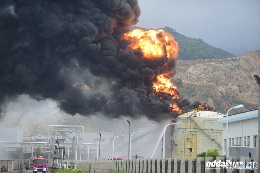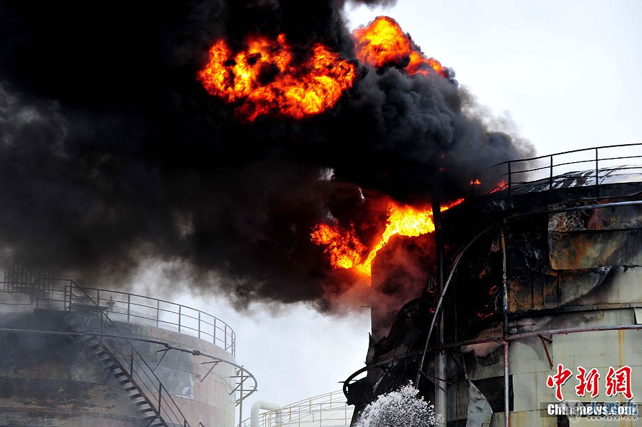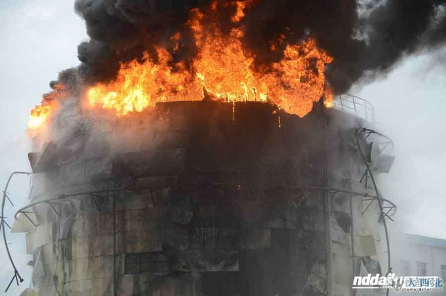 储油罐上侧不停的冒出火焰,储油罐周围都被烧的爆起铁皮。