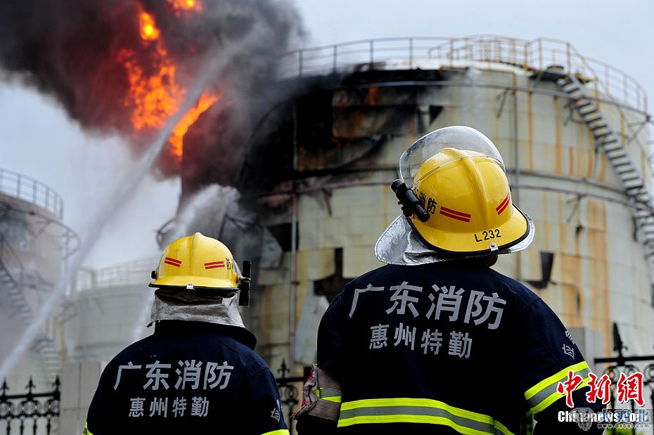 5月28日下午,大亚湾惠州兴达石化厂区苯乙烯罐发生火灾,惠州、深圳、东莞等几十辆消防车以及救援队急速赶赴现场施救。火灾现场浓烟滚滚、火焰冲天,空气中弥漫刺鼻气味,救援工作仍在继续。中新社发 陈文 摄