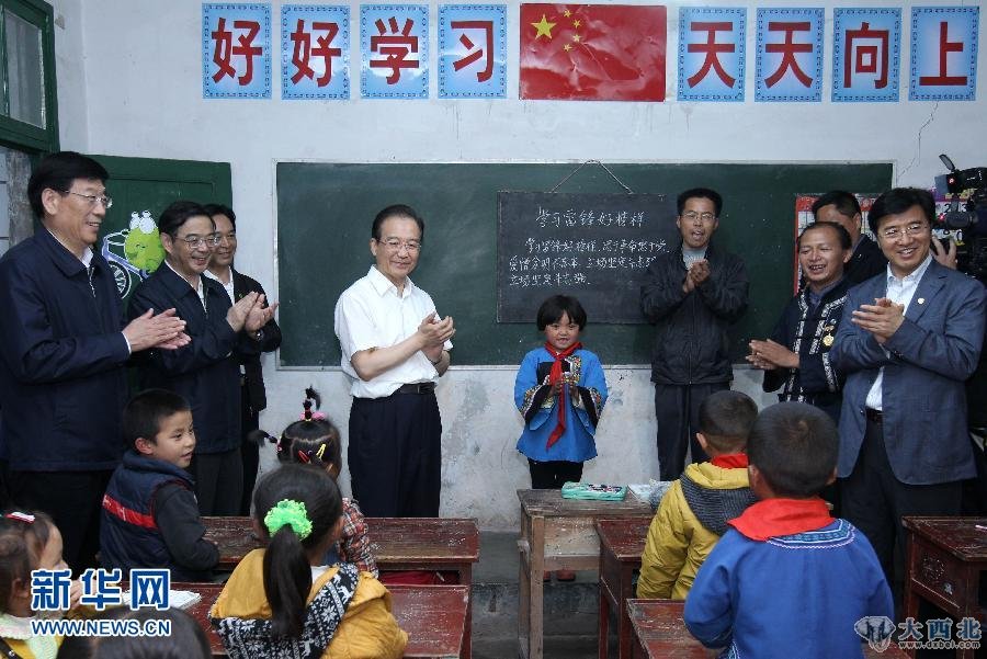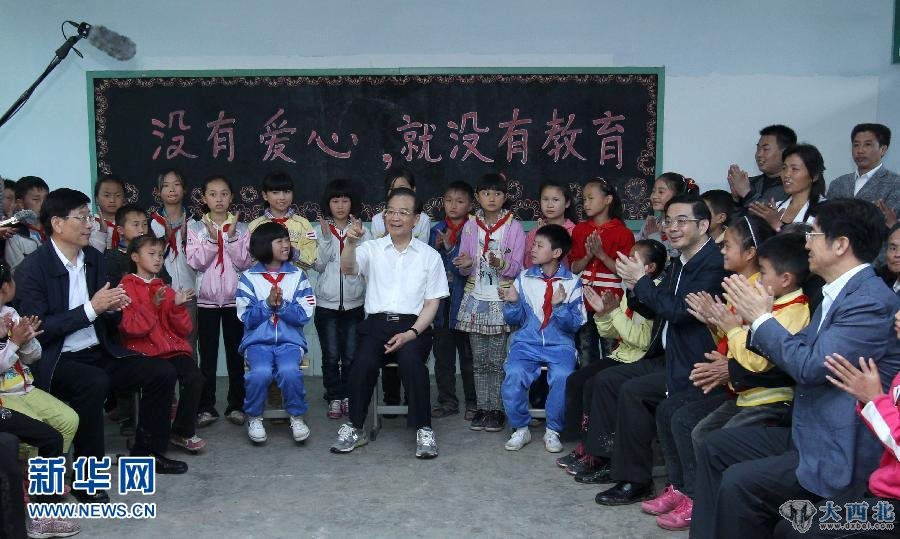 “六一”国际儿童节前夕,中共中央政治局常委、国务院总理温家宝在湖南湘西武陵山区调研扶贫开发工作时,专程到当地农村小学,看望慰问师生特别是在校的留守儿童,祝他们节日快乐。 5月25日,在古丈县默戎镇毛坪村教学点——毛坪小学,温家宝疼爱地看着孩子们说:“大家唱个歌吧!”孩子们高兴地喊道:“好!”。一个5岁的苗族小姑娘跑上讲台主动要当指挥。孩子们稚嫩的歌声打动着现场的人们。新华社记者 庞兴雷 摄
