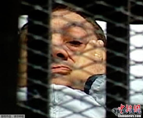 当地时间2011年8月3日,埃及前总统穆巴拉克躺着出现在开罗庭审现场,在铁笼中接受审判。