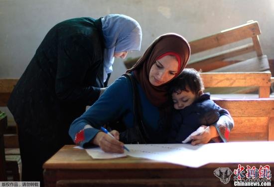 当地时间2011年11月28日,埃及人民议会议会下院选举第一阶段投票开始举行。这是自民众示威逼走执政数十年的穆巴拉克后,埃及举行的首次民主选举,许多人因此热情高涨,在各地排起长队投票。图为埃及开罗,一名妇女抱着孩子在投票点阅读选票。