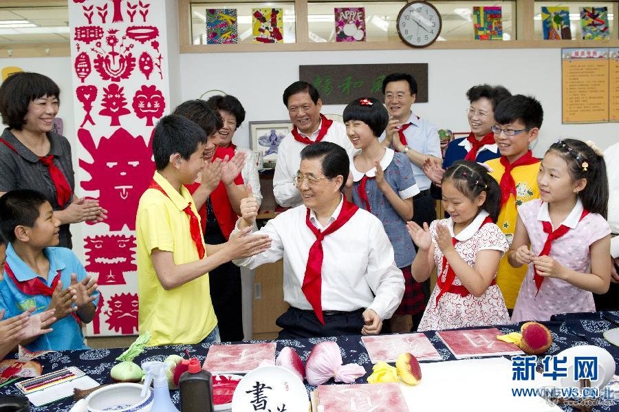 “六一”国际儿童节到来之际,中共中央总书记、国家主席、中央军委主席胡锦涛5月31日上午来到北京市东城区少年宫考察,亲切看望在这里参加活动的小朋友们。这是胡锦涛和失聪少年郑洪涛一起拓印“自强不息”4个大字,祝愿他和其他小朋友一样快乐,健康成长。新华社记者 黄敬文 摄