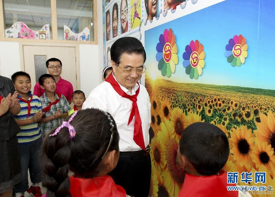 “六一”国际儿童节到来之际,中共中央总书记、国家主席、中央军委主席胡锦涛5月31日上午来到北京市东城区少年宫考察,亲切看望在这里参加活动的小朋友们。这是胡锦涛在少年宫的笑脸墙前同来自四川什邡和青海玉树地震灾区的孩子亲切交谈,了解他们现在的学习和生活情况。新华社记者 丁林 摄