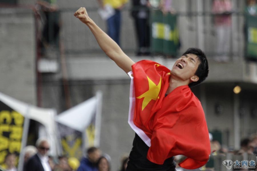 北京时间6月3日凌晨,国际田联钻石联赛尤金站110米栏比赛结束,位于第五道的刘翔以12秒87的成绩夺冠,创造了个人最好成绩的同时重回世界第一。不过由于比赛时风速达到每秒顺风2米4,已经超出正常风速,刘翔这个成绩并没有被承认为平世界纪录和破赛会记录,但仍是超风速下的世界最好成绩。图为刘翔身披国旗庆祝。