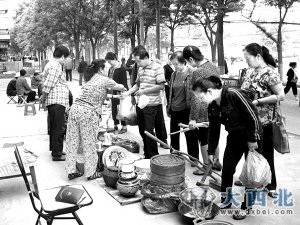 记者发现,这些摊贩和顾客交易时很少讨价还价,介绍“商品”时很耐心。一个中年女子指着一根手杖讲,“这个手杖大约是80年代在天水买的,样式很独特,和一般的手杖不同,不仅结实还有韧劲,原来一直留在家里当纪念,现在楼房要拆只好拿出来卖了。”一位老大爷把手杖拿在手里仔细看了一遍,高兴地花10元钱买下手杖。