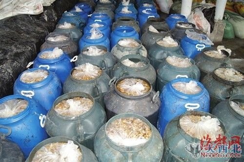 60多桶还在工业柠檬酸和盐水中浸泡的金针菇