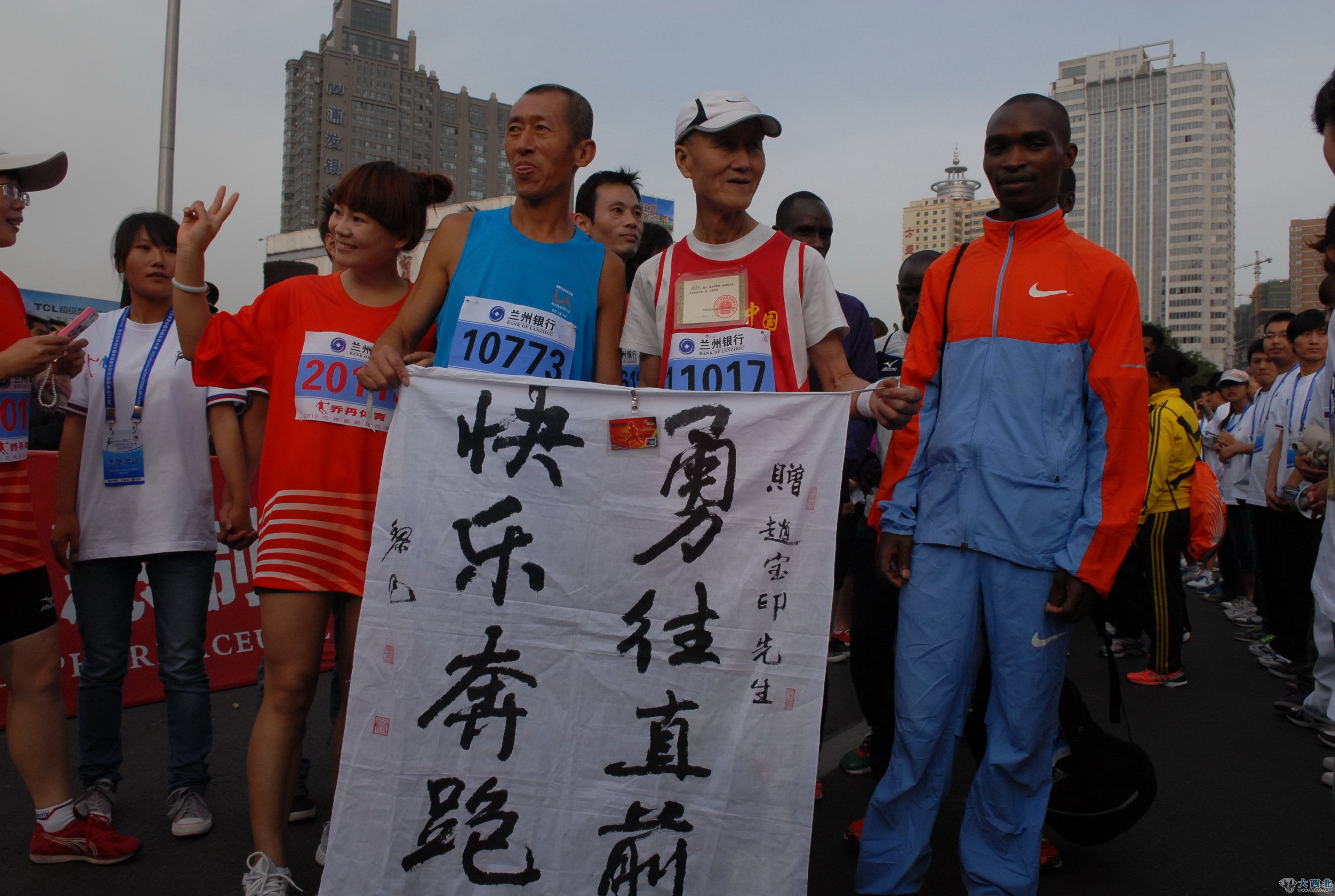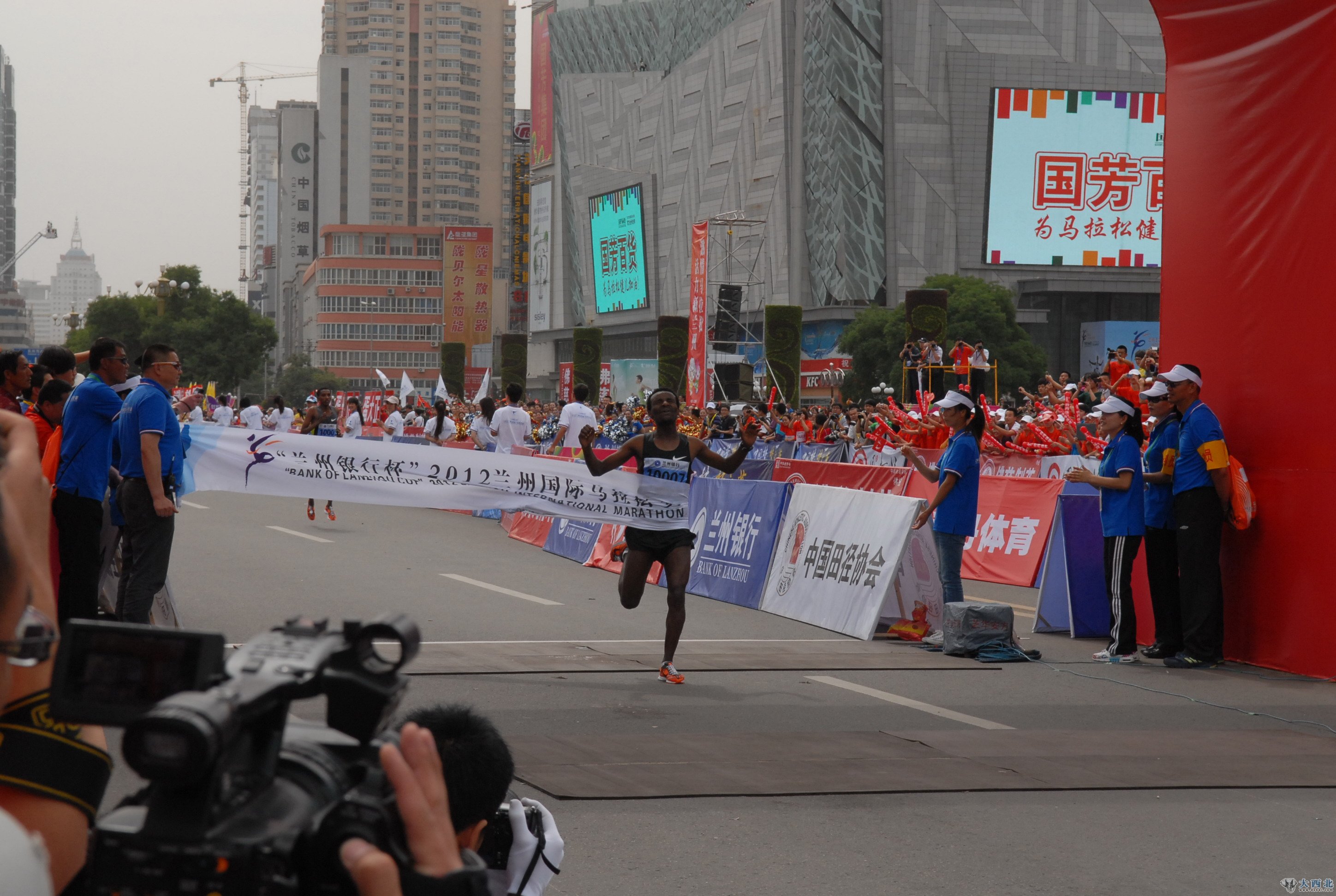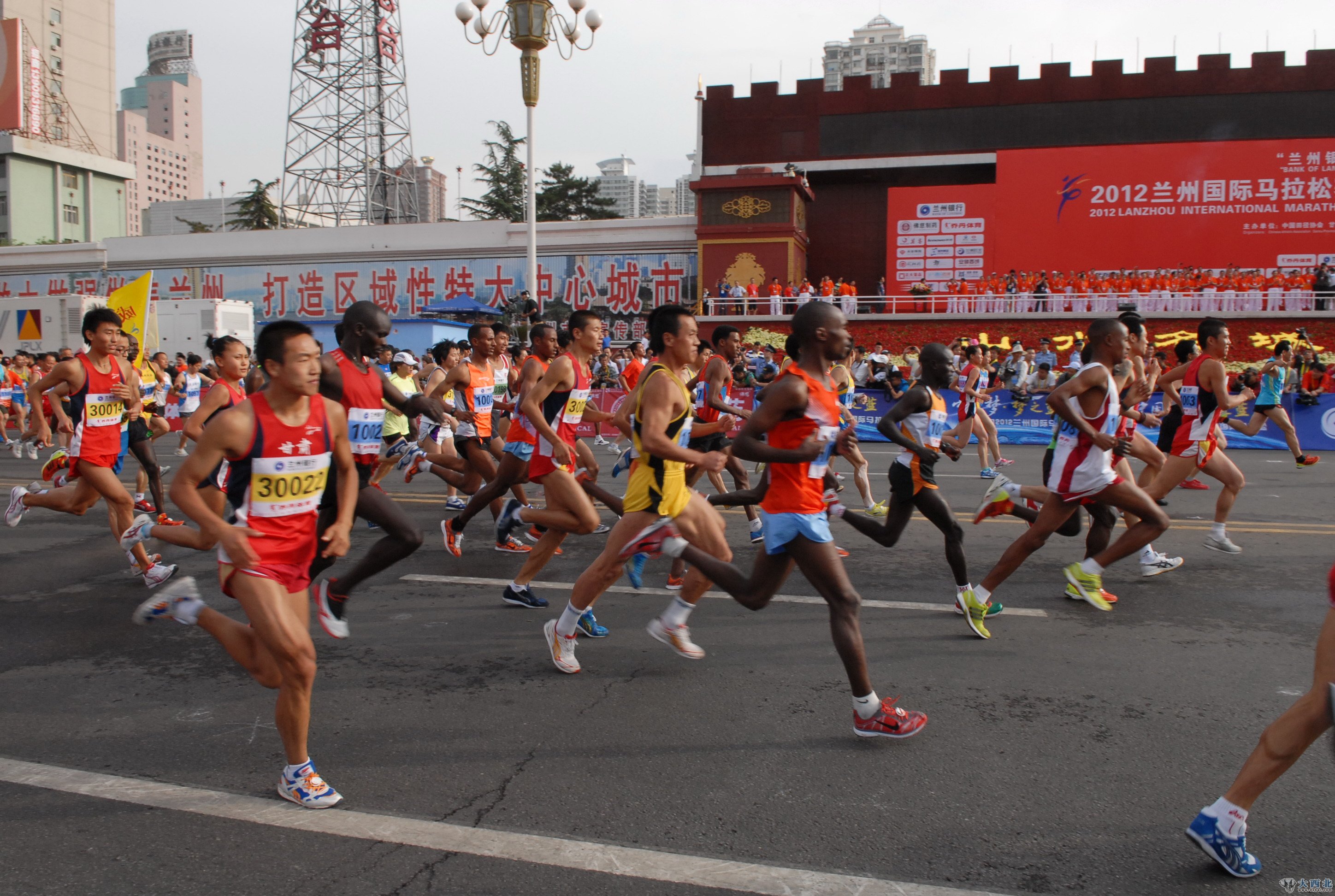 昨日上午8时,随着一声清脆的发令枪响,2012兰州国际马拉松赛暨全国马拉松积分赛正式开跑。随着肤色各异的专业选手率先冲出起跑线后,紧随其后的是身穿统一橘红色服装的庞大的市民队伍。他们中有七八十岁的老者,还有正在上学的五六岁的小孩,在欢快的奔跑中,他们喊着、笑着向终点进发,享受着跑步的乐趣。由于有近三万市民参与到本次活动中,使得他们川流不息地从起跑线涌出,庞大的人流在兰州的道路上汇聚成了一条红色的河流。直到20分钟后,当率先冲出的专业选手们已经跑出7公里之后,最后的人流才从起点出发。