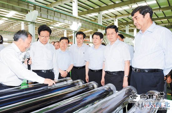6月9日,在省委书记、省人大常委会主任王三运,省委副书记、省长刘伟平等陪同下,新疆维吾尔自治区党委书记张春贤,自治区党委副书记、自治区主席努尔·白克力率领的新疆党政代表团在我省考察交流。这是代表团一行对兰州大成科技股份有限公司聚光太阳热能示范项目及关键装备研发情况进行考察。本报记者高樯本报兰州6月10日讯(记者徐爱龙)甘肃新疆两省区经济社会发展合作座谈会今天上午在兰州举行,双方共谋发展大计,共绘发展蓝图,就进一步加深合作交换意见,并签署了两省区战略合作框架协议。