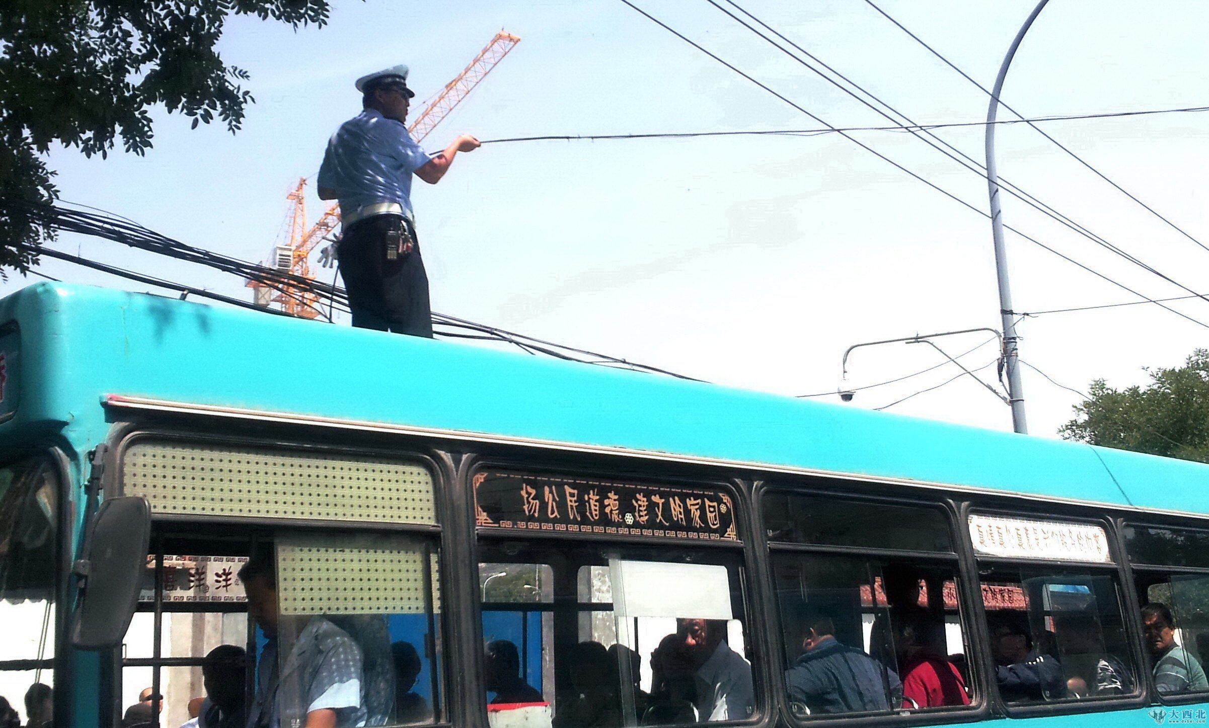 李德峰站在公交车顶举起电缆线保障车辆正常通行