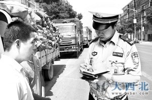 ◇记者 金振华 程健 文/图鑫报讯 为缓解城区交通堵塞,改善通行条件,根据兰州市公安局发布的《货车限行通告》有关规定,城区道路已于2012年6月6日起限制部分货车通行。昨日,东岗交警大队民警顶着烈日正式上路,查处货车违反限行规定等各类严重影响交通秩序的交通违法行为。