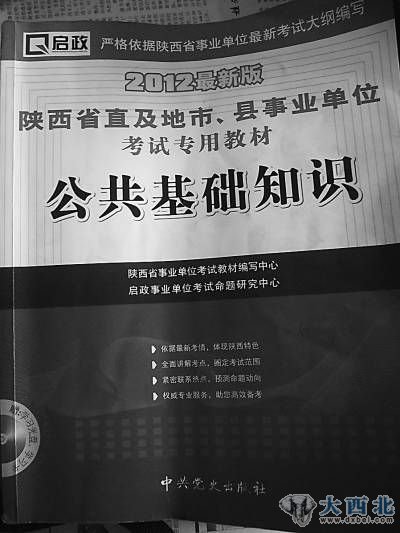 6月17日举行的陕西米脂县2012年公开招聘事业单位工作人员笔试,被曝出现了“神奇”的参考书——一本名为《公共基础知识》的陕西省直及地市、县事业单位考试专用教材(2012年最新版)。