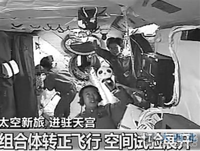 19日晚,刘洋和刘旺玩起了熊猫玩具。当晚,3名航天员利用闲暇时间,尽情体验了太空失重的美妙生活。央视视频截图原标题:天宫神九组合体“转正”飞行新京报讯 (记者仲玉维 通讯员谢波 姜宁)昨日6时18分,在北京航天飞行控制中心的精确控制下,天宫一号与神舟九号组合体在太空中进行了第一次姿态调整,使其从交会对接的倒飞状态进入正常飞行姿态,为预计在24日进行的手动交会对接做准备。