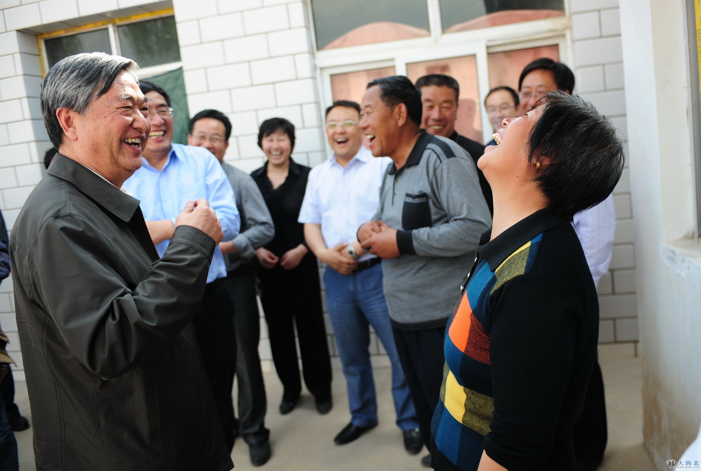 在甘肃省定西市安定区太平村,新华社社长李从军(前左)采访养鸡专业户陈云花(前右)。说到高兴处,陈云花开怀大笑