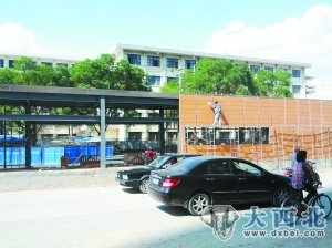 甘肃政法学院附近,工人正在进行车站外装饰作业。本报记者 师向东 摄