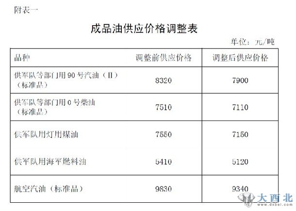 一、成品油生产经营企业供军队及新疆生产建设兵团、国家储备用汽、柴油(标准品,下同)供应价格每吨分别降低420元和400元,调整后的汽、柴油供应价格分别为每吨7900元和7110元。其他成品油价格相应调整。调整后的成品油标准品价格见附表一。非标准品价格由成品油生产经营企业按照国家规定的品质比率确定。
