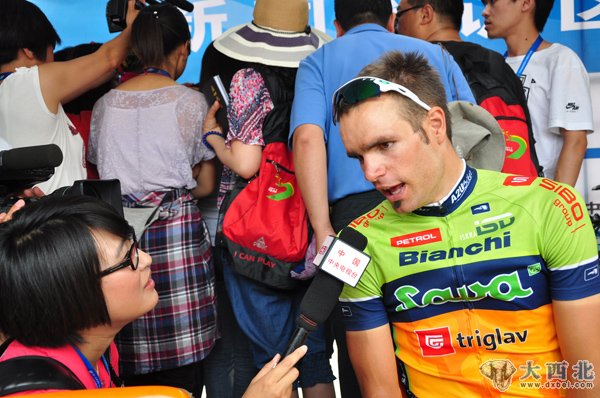兰州赛段第一名斯洛文尼亚萨瓦队鲁卡接受中央电视台记者采访。 贾笑云 摄