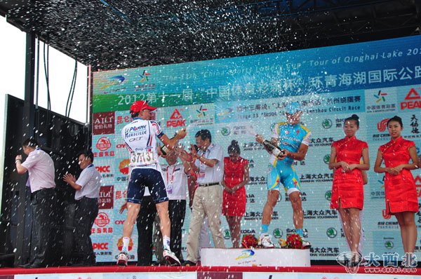 第十一届环湖赛兰州赛段获奖选手互喷香槟酒庆贺。 贾笑云 摄