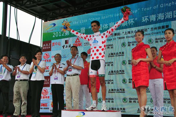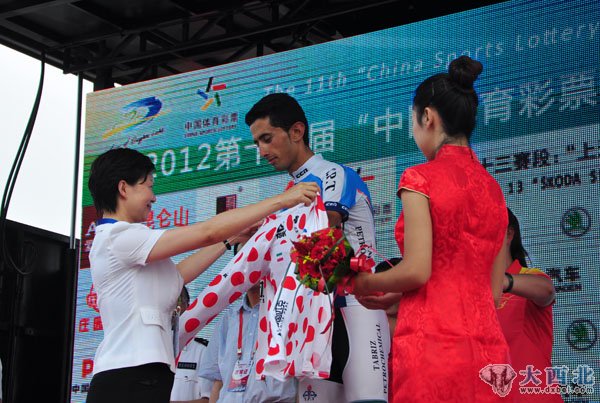 兰州市副市长周丽宁为第十一届环湖赛总冠军阿里扎德颁发爬坡冠军的圆点衫。 贾笑云 摄