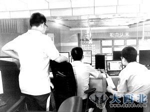 大西北网工作人员和兰州公安在线工作人员正在实时监控大屏幕画面鑫报讯 昨日,2012年第十一届环青海湖国际公路自行车赛甘肃段于10时举行,为了呈现赛事,大西北网与兰州公安强强联手,通过新浪微博即时、权威地播发了赛事实况,得到广大网民的关注。