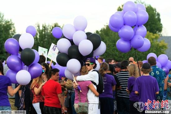 当地时间7月20日,美国科罗拉多州奥罗拉市,民众放飞气球悼念一名在影院枪击案中的遇难者。