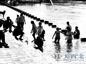 昨日下午,记者乘车在城区黄河两岸发现,许多人都来到岸边尽情地享受与水更进一步距离的休闲。在城关近水广场,一些孩子及青年,来到河边的水里戏水,在黄河北的近水音乐广场,人们一边欣赏着河边的水景,一边举起相机拍起兰州的黄河;在雁滩黄河大桥与天水路黄河大桥的南岸,一些来自雁滩的孩子,还在漫过河边滩地的河水里洗起了燥来!