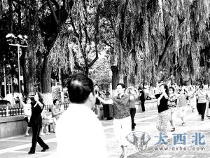 顺河堤向下望去,水位明显比7月30日下降。河边一座建筑物立柱明显留下洪峰过后的水印,水势显得平缓,水流之处可看到露出的湿地。黄河母亲景点音乐声几十米外就能听到,间隔几米就有跳健身舞的人群。一名正在跳舞的中年女子讲,“由于黄河暴发洪水,我们有些担心,已连续几天没到河边活动了。今天河水下降,大家又重新出来,跳得格外开心,几天的郁闷心情一扫而光!”