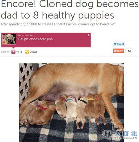 国际在线专稿:据英国《每日邮报》报道,全球首只商业克隆克隆狗兰斯洛特·安可(Lancelot Encore)近日通过人工授精技术当上“狗爸爸”,生下了8只小狗。