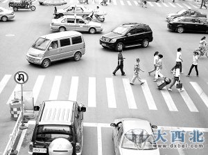 鑫报讯 连日来,记者观察发现,双城门十字附近虽然已经修建两座过街天桥,道路两边也安装上了护栏,但由于人流量大,行人随意乱穿马路的现象依然严重。记者估算了一下,在短短10分钟里,这里竟然有近百人不顾红灯,横穿马路。